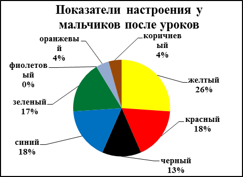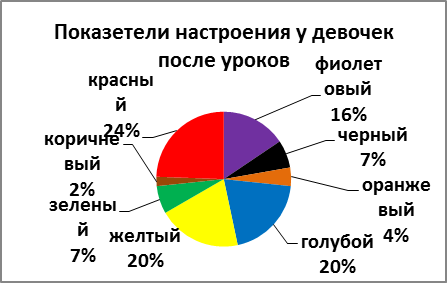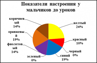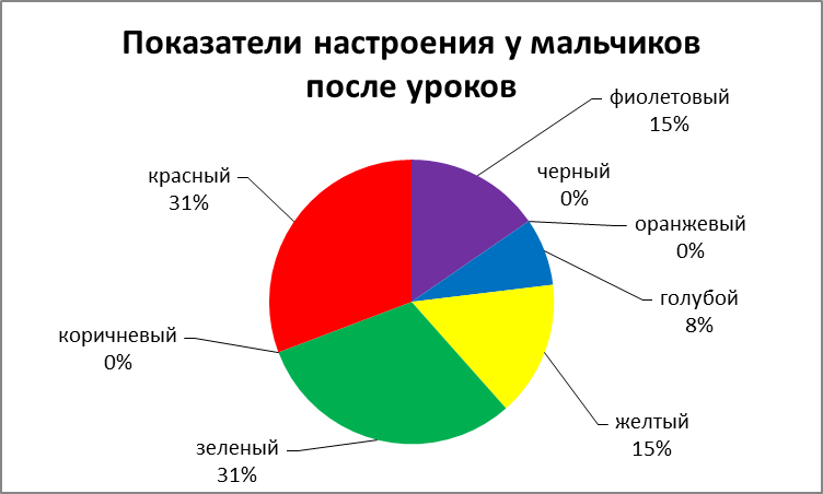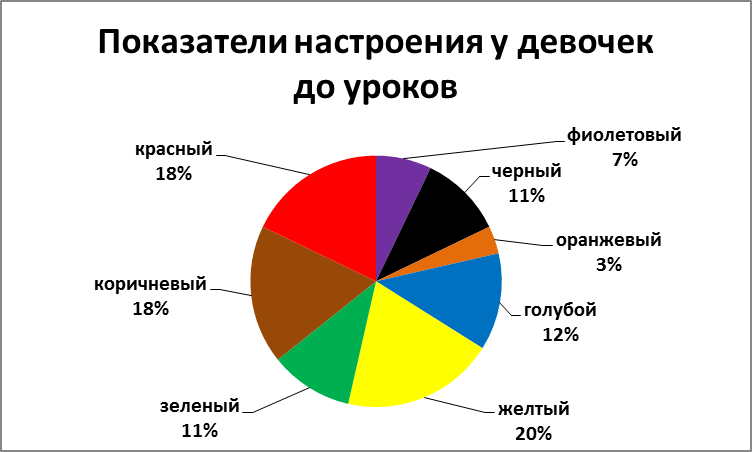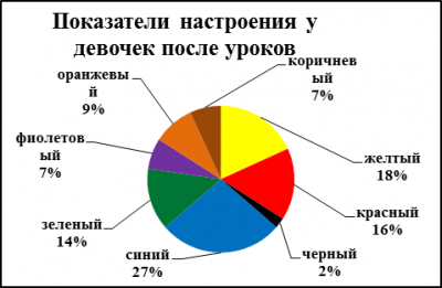 Проанализировав эмоциональное состояние мальчиков и девочек до и после уроков, мы выявили, что мальчики до уроков активны и веселы 24%, (Рисунок 5.1; Рисунок 5.2), к вечеру же активность повышается еще на 2% (Рисунок 6.1; Рисунок 6.2). Рассматривание эмоционального состояния девочек до уроков: все их силы направлены на общение 31% (Рисунок 7.1; Рисунок 7.2), после уроков они становятся спокойными и удовлетворенными 26% (Рисунок 8.1; Рисунок 8.2).