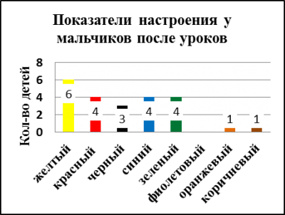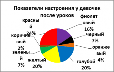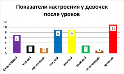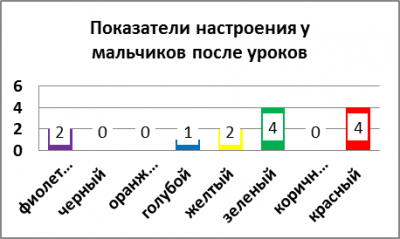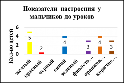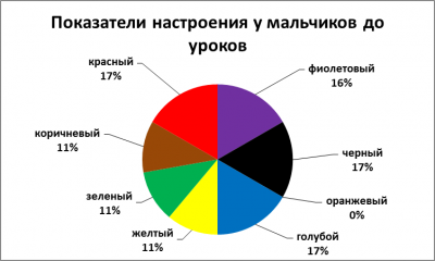 В результате проведенной опытной работы (2013 г.) мы получили следующие результаты: при анализе цветовой гаммы рисунков девочек выяснилось, что перед уроками 20% из них активные и веселые, но после уроков у них возрастает агрессивность 24%. (Рисунок 1.1; Рисунок 1.2). Мальчики же более напряжены перед уроками 17% (Рисунок 3.1; Рисунок 3.2), после уроков у одних учащихся повышается агрессивность, что составляет 31%, а у других появляется чувство уверенности, что также соответствует 31% (Рисунок 4.1; Рисунок 4.2). Таким образом, мы доказали теорию Люшера, что мальчики-подростки имеют более выраженную тревожность, чем девочки.