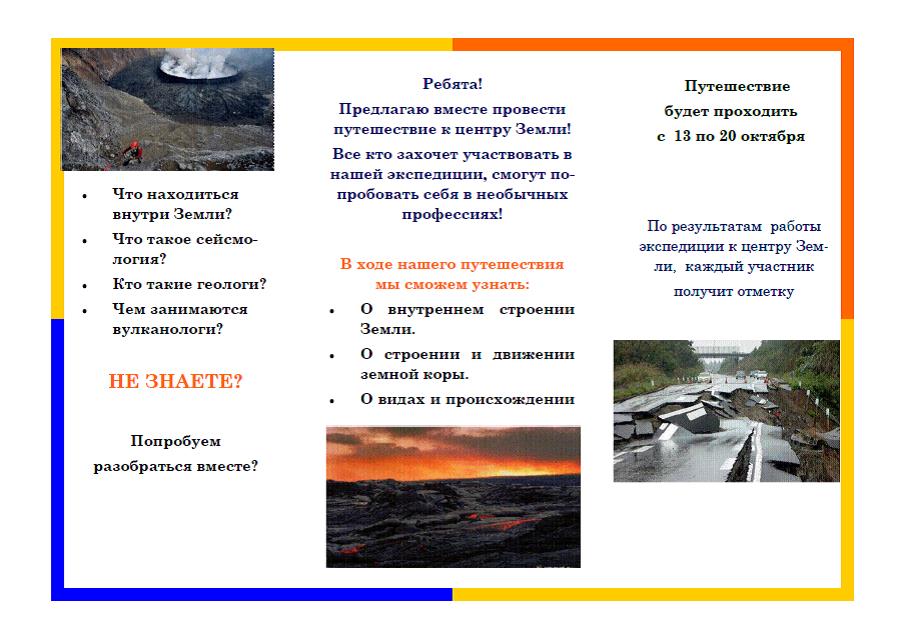 Краткая аннотация: проект поможет сформировать у обучающихся представление о внутреннем строении Земли, строении и движениях земной коры, видах и происхождении горных пород. Работая над проектом, учащихся будут поставлены в условия необходимые для формирования умения и навыков самостоятельной познавательной деятельности и самоанализа, параллельно проект познакомит ребят с профессией вулканолога, сейсмолога, геолога.