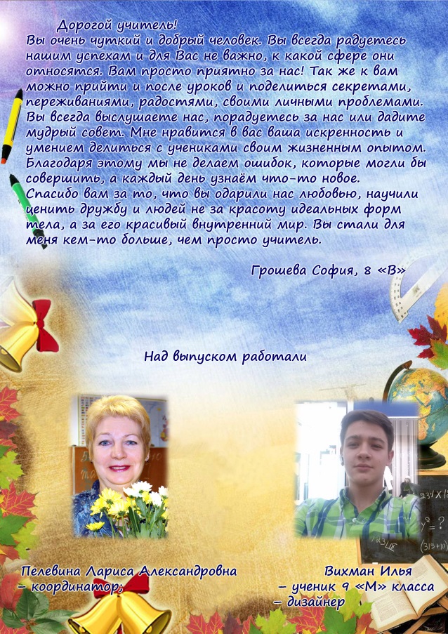 Так же мы относимся и к созданию «копилки» творческих работ учащихся. Есть копилка – найдём её применение. Журнал «Лицеист» печатает творческие работы наших лицеистов. Пятый год редакция НОУ выпускает газету периодичностью один номер в четверть и специальные выпуски, посвящённые юбилейным датам. Сейчас в работе находится номер, посвящённый 70-летию Победы и 50-летию Лицея Информационных Технологий. Основные наполняющие газеты – новости лицейской жизни, вести из классов, творческие работы наших детей, интервью с преподавателями и лицеистами, полезные советы. Задумок по совершенствованию газеты много, но самое главное, что у нас есть – это желание детей, которые легко загораются и работают творчески.