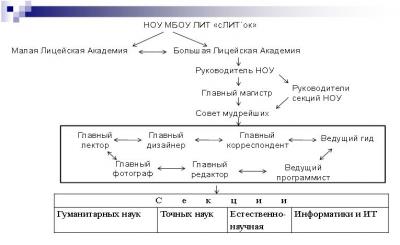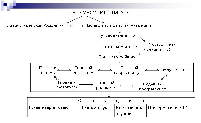 НОУ состоит из Малой и Большой Лицейских Академий. Я являюсь руководителем Большой Лицейской Академии, то есть учащихся второго и третьего уровней образования. Моими помощниками являются главный магистр и совет мудрейших, которые непосредственно сотрудничают с руководителями секций НОУ, а также с главным редактором, лектором, корреспондентом, программистом, дизайнером, фотографом, экскурсоводом. У каждой рабочей группы свои цели и задачи, одной из которых является сотрудничество с секциями точных и гуманитарных наук, естественнонаучного цикла, информатики и ИКТ. Активисты НОУ – это одарённые, мотивированные, творческие, способные дети в соответствии с их интересами.