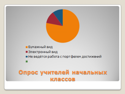 Среди практикующих учителей начальных классов г. Новосибирска был проведён опрос. Лишь 12% учителей выбрали использование электронного портфеля достижений. Отсюда возникает недоумение: почему такая инновационная форма ведения портфеля достижений не пользуется успехом у современных педагогов.