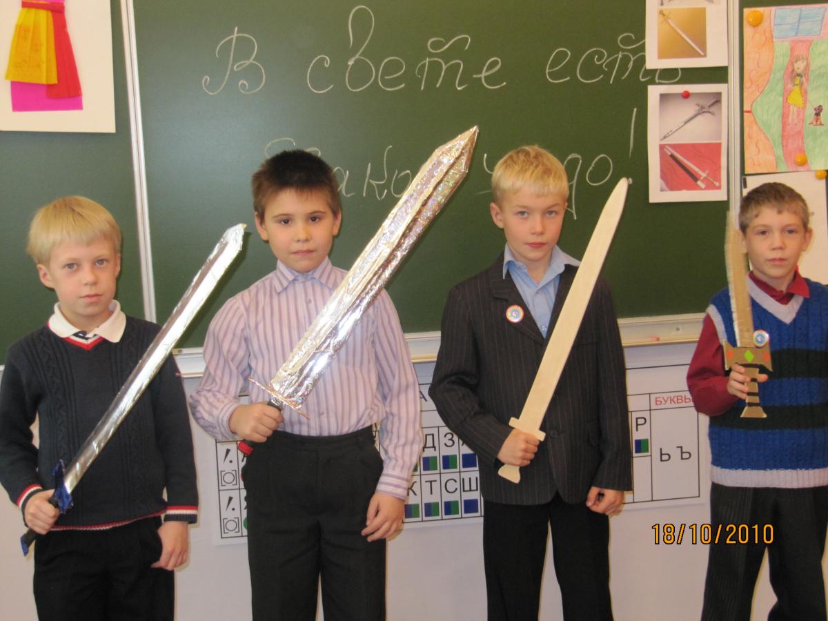 В 3 классе у меня есть опыт проведения творческих проектов. Так, на уроке литературного чтения итогом изучения темы «Народные сказки» стало представление групповых исследовательских проектов в театрализованной игре «В свете есть такое чудо». Темы: «Народный костюм», «Русские народные игры», «Оружие». Дети самостоятельно ознакомились с историей возникновения платка, сарафана, изучили образцы народного костюма разных регионов России, самостоятельно разработали небольшую коллекцию сарафанов. Группа мальчиков изучила историю возникновения русского меча, как его использовали и где. Итогом стало изготовление мечей по эскизам из интернета, боем на мечах.