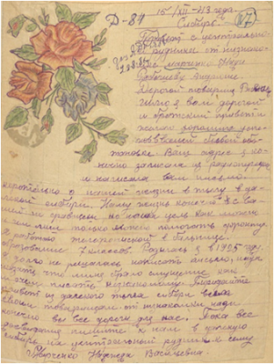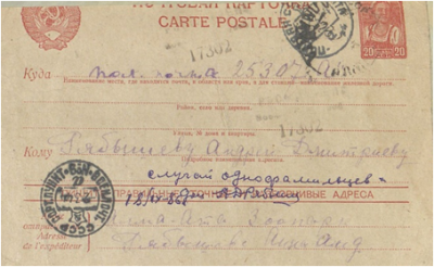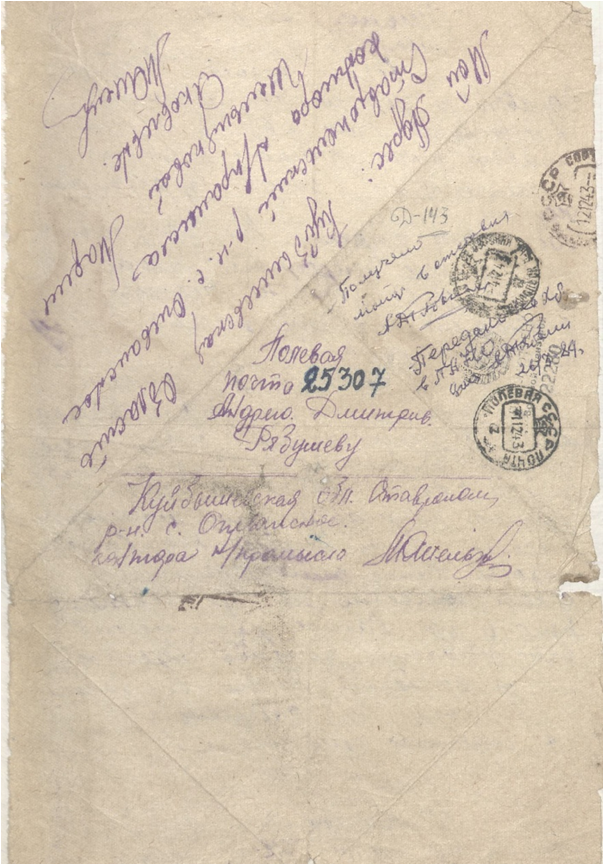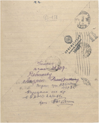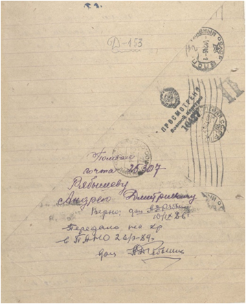 Земляки и трудящиеся многих республик Советского Союза, услышав нас, горячо откликнулись. На нашу полевую почту стали поступать посылки с одеждой, обувью, продуктами и письма».[i] Письма, бережно наклеенные в альбом самим Андреем Дмитриевичем, лучше всего передают дух того времени. Каждое письмо написано разным почерком и разными чернилами, чаще, чуть видимым карандашом, на клочках и обрывках серой бумаги, иногда и на типографских бланках, но в каждом письме величайшее стремление помочь фронту, поддержать тех, кто лицом к лицу, каждую секунду рискует жизнью ради свободы своего Отечества. Эти треугольники со штемпелем полевой почты № 25307 служили бойцам источником боевых сил и помогали выстоять в тех невыносимых условиях.