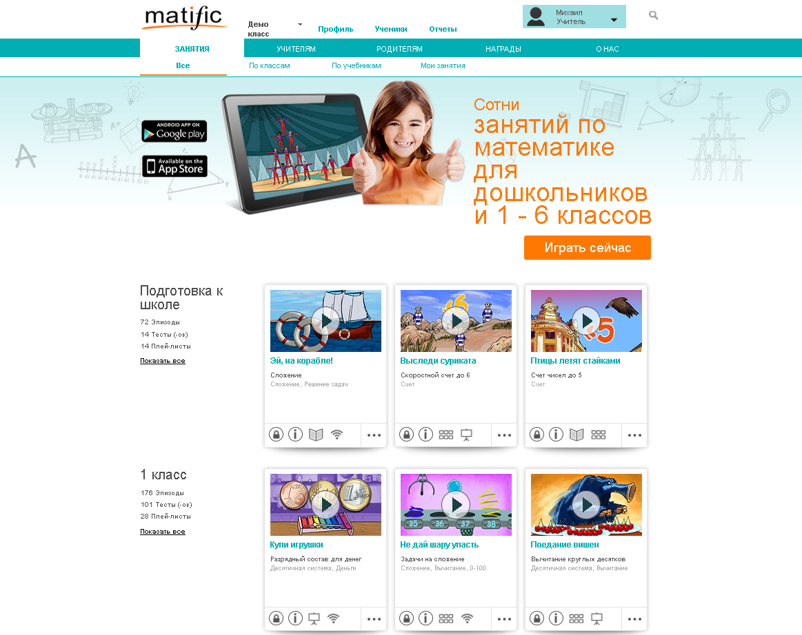 Matific(www.matific.ru) – это отмеченный многочисленными престижными наградами онлайн-сервис, содержащий сотни интерактивных, занимательных и простых в использовании заданий по математике, которые призваны научить каждого ребенка думать как математик. Неслучайно девизом Matific является «Возвращаем «Ух-ты!» в изучение математики». Кроме этого, данный сервис содержит эффективные инструменты для учителей по управлению классами и отслеживанию успеваемости учеников в каждом классе (рис. 1).