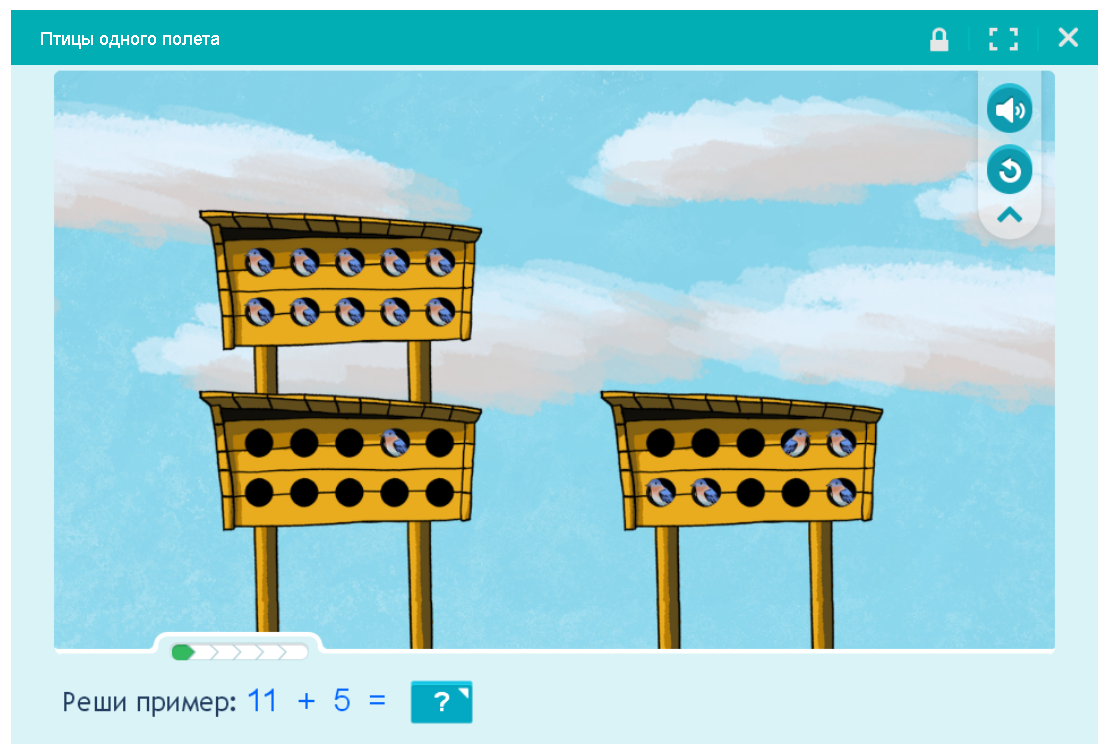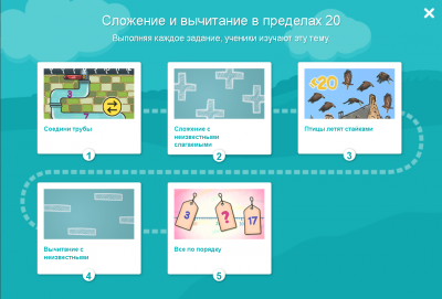 Минимальный учебный объект Matific называется «эпизод» и представляет собой серию взаимосвязанных интерактивных заданий, упорядоченных по нарастанию сложности, основанных на деятельностном подходе к работе ученика и представленных в игровой анимированной форме (рис. 5). Каждый эпизод ориентирован на выполнение за один сеанс работы длительностью от 5 до 15 минут и посвящен одному точно определенному математическому понятию, навыку или идее, предусмотренной требованиями образовательного стандарта и программы обучения по математике. Целью интерактивного взаимодействия ученика с эпизодом является приобретение учеником интуитивного понимания математического понятия, навыка или идеи, являющегося темой данного эпизода.