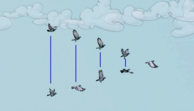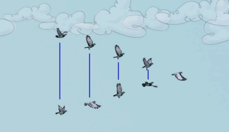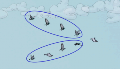 2) Системно-дейтельностный подход к работе ученика. Для успешного освоения более сложных понятий и разделов математики в старших классах большое значение имеет пропедевтика этих понятий в младших классах, когда данное понятие в упрощенной и наглядной форме преподносится ученикам на уровне, доступном их пониманию в данный момент. Проиллюстрируем сказанное на примере. Известно, что большая часть курса математики в начальной школе связана с изучением и отработкой на практике четырех основных арифметических действий: сложение, вычитание, умножение и деление, каждое из которых изучается на разных уровнях в течение всей начальной школы и первых классов основной школы. Одним из вариантов пропедевтики к изучению деления является ознакомление учеников с концепцией четных и нечетных чисел, основанной на элементарной форме деления, а именно – делении на 2. Рассмотрим данный вариант на примере эпизода «Ранняя пташка», в котором на экран вылетает стая птиц, расположенных в определенной конфигурации, и задача ученика состоит в том, чтобы определить является ли число птиц четным, или нет. В основе поиска ответа на данный вопрос лежит деятельность ученика, которая может осуществляться по одному из двух сценариев: а) разбить стаю птиц на пары (рис. 2); б) разбить стаю птиц на две равных по численности группы (рис. 3) (важно, что графические пометки могут быть выполнены при помощи функционала интерактивной доски при разборе данного эпизода перед классом).