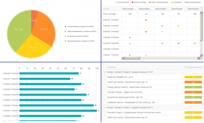 Учителю предоставляются инструменты для отслеживания успеваемости учеников в реальном времени. Учительская панель предоставляет несколько видов отчетов успеваемости, как всего класса, так и для каждого ученика в отдельности (рис. 2), которые можно сохранить в формате электронных таблиц. Система адаптируется к потребностям каждого ученика: программа усложняет задания тем, кто хорошо ее освоил и отлично справляется, и поддерживает тех, у кого возникают трудности. Результаты предоставляются в реальном времени.