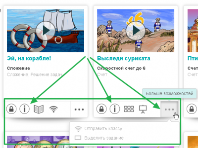 – управление доступностью заданий для учеников каждого класса, возможность назначить выбранные задания для работы в классе или домашней работы и скрыть от учеников остальные задания;