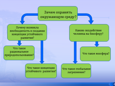 Охрана природы – задача нашего века, проблема, ставшая социальной. Снова и снова мы слышим об опасности, грозящей окружающей среде, но до сих пор многие из нас считают эту проблему неприятной, не касающейся их лично. Зачастую, при изучении учащимися школьного материала экологической направленности, возникает масса вопросов, связанных прежде всего с непониманием того, к каким последствиям может привести необдуманная деятельность человека в экосистемах. И возникает вопрос: «Зачем охранять окружающую среду?»