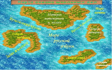 На карте Океана Школьных Дел есть: Материк Математики, Море Русской Азбуки, Пролив Робинзонов, Полуостров Мастеров, Остров Гладиаторов, Музыкальный Пролив, Залив Живописи, Море Мечты.
