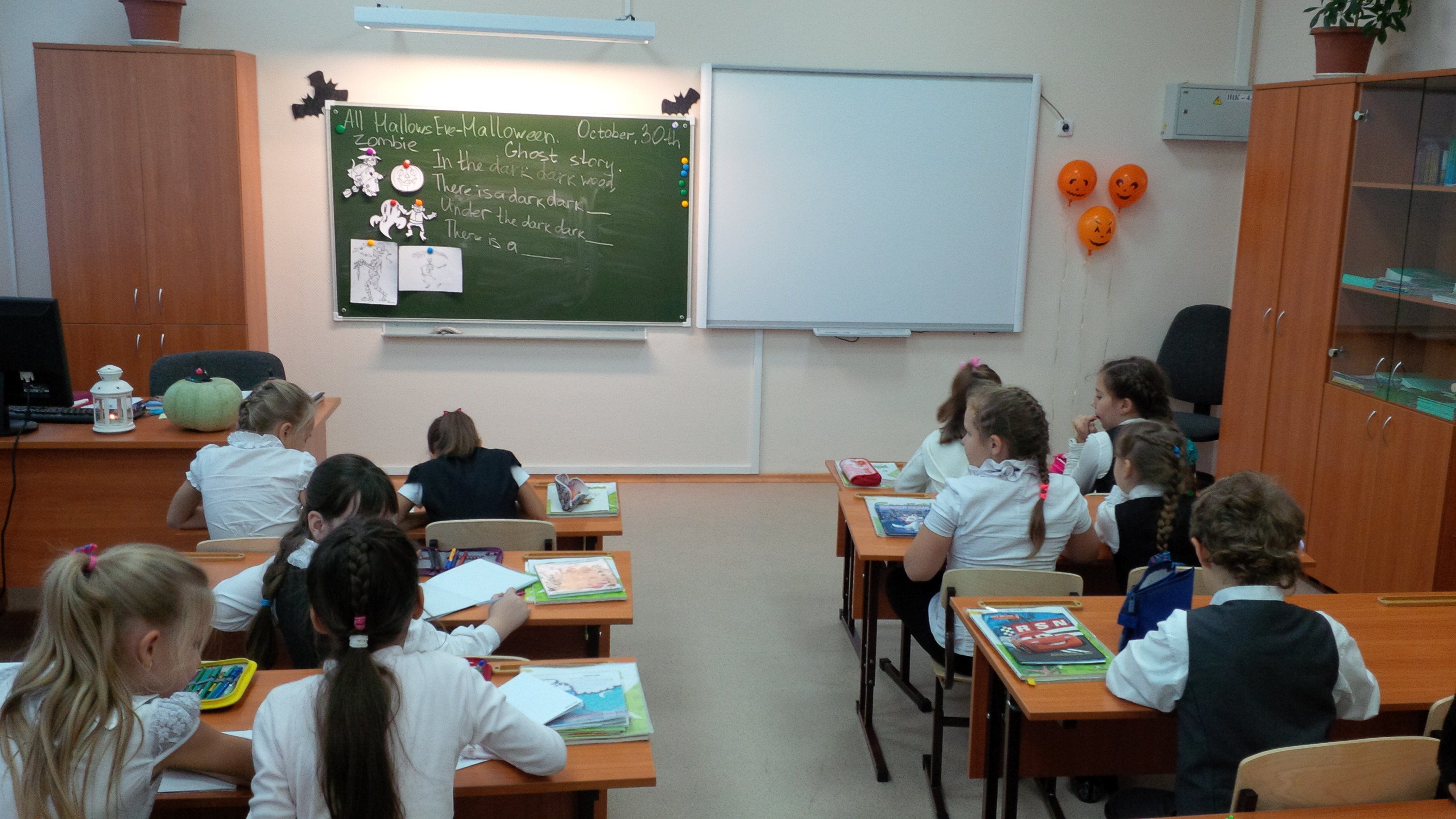 Приветствует учеников, организует внимание, вводит в тему урока. Good morning, kids! I’m glad to see you! Today we are celebrating Halloween. It’s on the 31st of October. Children make Jack-O’Lanterns out of pumpkins. They dress up witches, ghosts, skeletons. They walk from house to house and ask “Trick or treat?” Colours of Halloween are orange and black. |