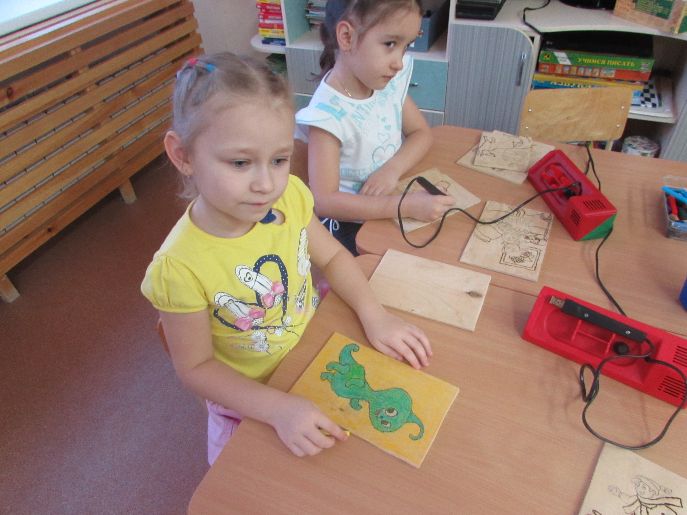 Выжигание – интересное занятие, сейчас, к сожалению, почти забытое. Считается, что для детских садов выжигание не очень подходит, так как связано с электричеством. Но опыт показал, что этот вид творчества вполне доступен дошкольникам, конечно, с соблюдением всех необходимых мер безопасности. Я подготовила педагогический проект «Выжигание по дереву». Целью данного проекта является развитие мелкой моторики и подготовка руки к письму у дошкольников через обучение навыкам выжигания по дереву. Работа организовывается в форме кружковой деятельности. Наш кружок называется «Искорка». Занятия проходят 1-2 раза в неделю во второй половине дня. На первом этапе были проведены консультации для родителей по вопросам развития мелкой моторики и подготовки руки к письму, а также оказание практической помощи родителям в обучении выжиганию своих детей. Для работы с детьми по выжиганию необходимо наличие оборудования: приборы для выжигания, фанера, эскизы для выжигания. Приборы нам закупил детский сад, с фанерой помогают родители, а эскизы мы выбираем вместе с детьми.