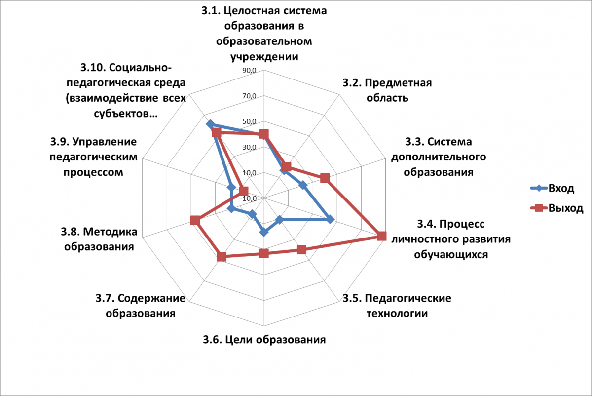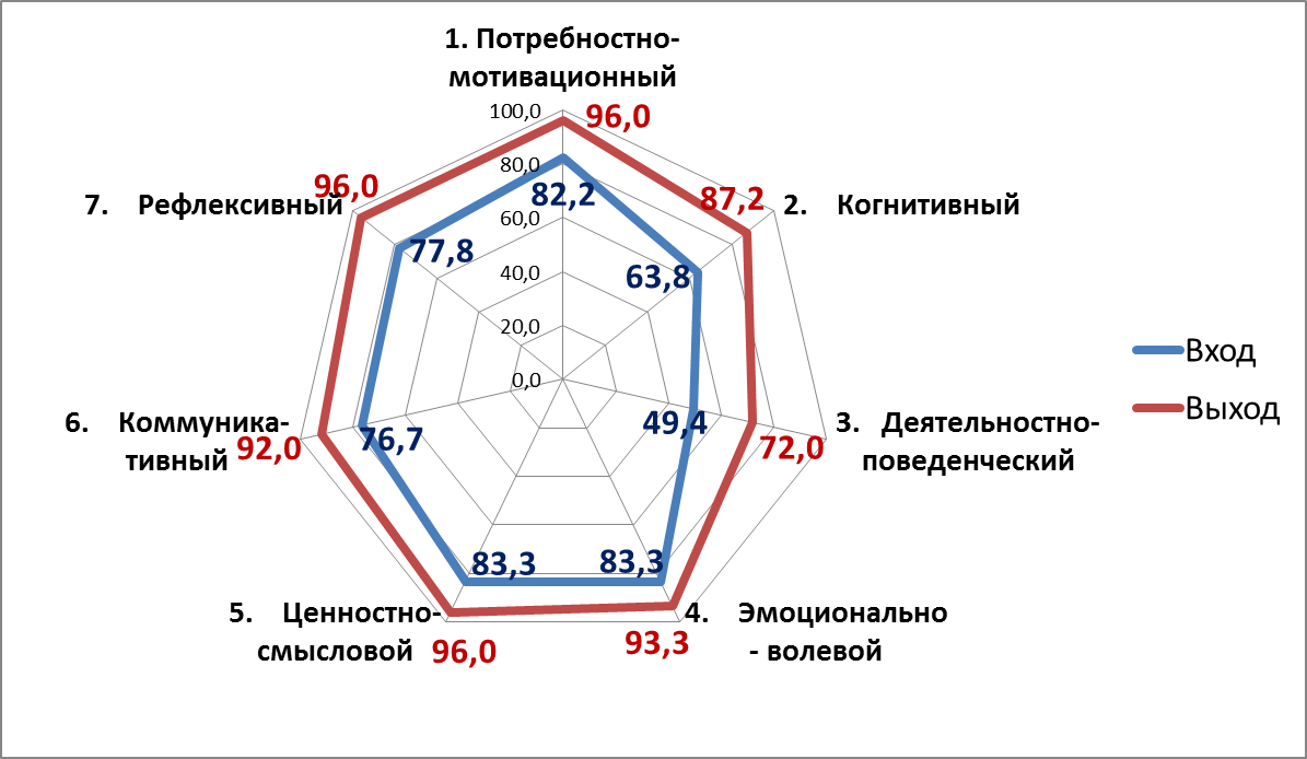 Сформированность профессиональной компетентности работников образования в области общего образования для устойчивого развития, воспитания экологической культуры, здорового и безопасного образа жизни в соответствии с требованиями ФГОС и профессионального стандарта педагога на основе самоанализа возросла на 36,7% (далее – Деятельность). Наибольший прирост отмечен по когнитивной (на 36,7%) и деятельностной (на 45,6%) компонентам.