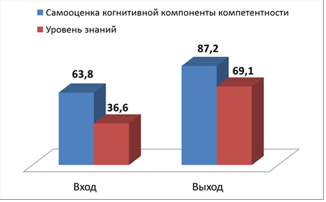Самооценка в начале обучения составила 63,8%, объективная оценка уровня знаний составила 36,6%. Средняя разница в оценках составила 27 процентных пункта или 42,6%. После обучения самооценка составила 87,2%, объективная оценка уровня знаний составила 69,1%. Средняя разница в оценках составила 18 процентных пункта или 20,8%.