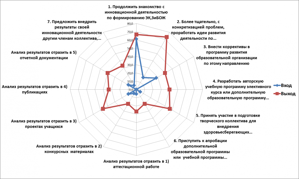 При оценке своей позиции в профессиональной деятельности по формированию экологической культуры здорового и безопасного образа жизни большинство слушателей (67%) остались на начальном уровне «продолжить знакомство с инновационной деятельностью по формированию ЭК,ЗиБОЖ». Более 73% слушателей отметили позицию «более тщательно, с конкретизацией проблем, проработать идеи развития деятельности по формированию ЭК,ЗиБОЖ в своей образовательной организации». Однако по всем позициям отмечается прирост выборов, что свидетельствует о понимании слушателями полного цикла инновационной деятельности, предназначенной для обмена инновационным опытом, создания и распространения в массовой практике новых образовательных продуктов – образовательных программ и технологий.