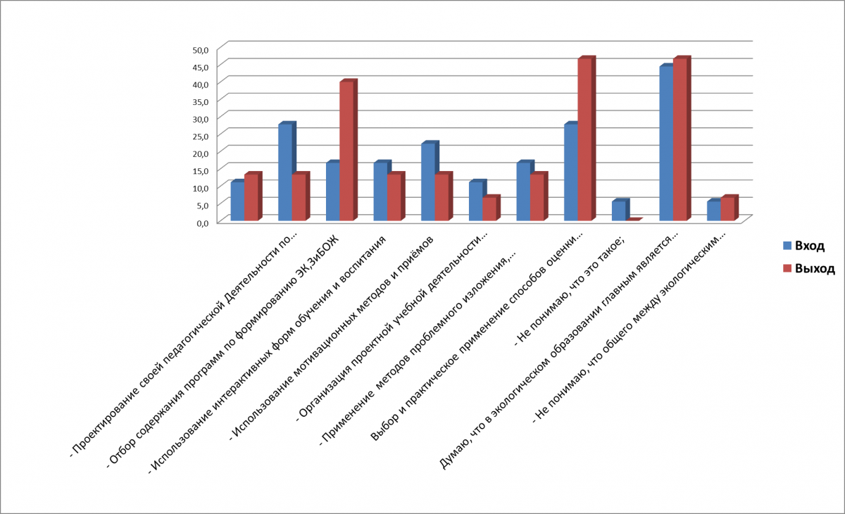 Таким образом, выявлена проблема: низкая профессиональная готовность при высокой самооценке (по когнитивному компоненту) учителя к инновационной деятельности по формированию у обучающихся экологической культуры, здорового и безопасного образа жизни.