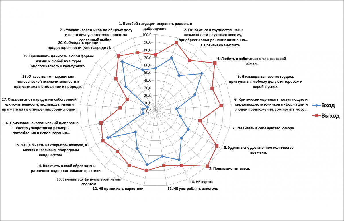 После обучения наиболее популярными (90 – 100% выборов) правилами были: Любить и заботиться о членах своей семьи; Правильно питаться; Относиться к трудностям как к возможности научиться новому, приобрести опыт решения жизненно важных задач; Уделять сну достаточное количество времени. Наименее популярными (40 – 60% выборов) правилами оказались следующие: Развивать в себе чувство юмора; Отказаться от парадигмы собственной исключительности, индивидуализма и прагматизма в отношениях среди людей; Отказаться от парадигмы человеческой исключительности и прагматизма в отношении к природе. Последнее свидетельствует о трудностях принятия слушателями правил экологически целесообразного здорового и безопасного образа жизни, о преобладании эгоцентрического потребительского отношения к жизни, что является риском в реализации профессиональной деятельности по формированию ЭК, ЗиБОЖ.