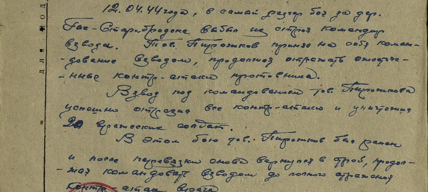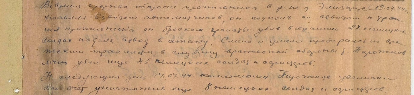 В документе, скопированном на этом рисунке, плохо читается текст, но я его все же расшифровала. Текст гласит: «Во время прорыва обороны противника в р[айо]не д. Элиздус (13.07.44) управлял взводом автоматчиков, он подполз со взводом к траншее противника, он, броском гранаты убив в траншее двух немецких солдат, повел взвод в атаку. Смело и умело пробираясь по вражеским траншеям в глубину вражеской обороны,б[оец]Пирожков лично убил еще четырех немецких солдат и офицеров. На следующий день, 14.07.44, комсомолец Пирожков уничтожил еще восемь немецких солдат и офицеров».