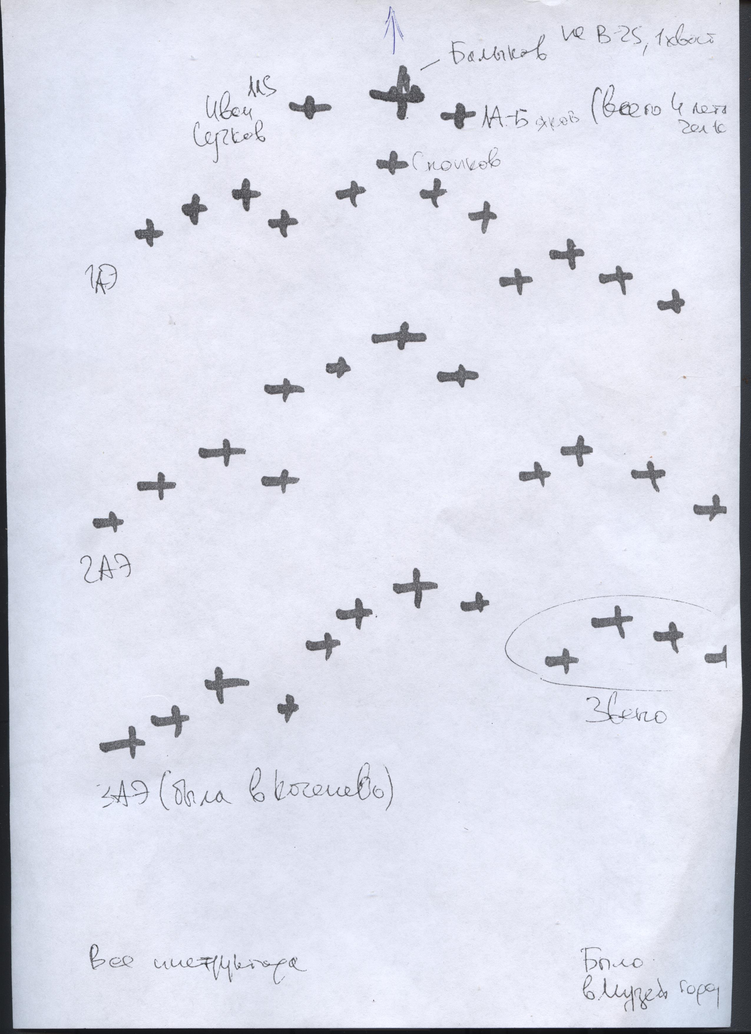 Примечание: на схеме, которую нарисовал летчик, есть ошибка. Ведущий самолёт подписан как «B-25, 1 хвост», но у B-25 (Митчелл) два хвоста, и этих бомбардировщиков было немного – их союзники поставили нам всего 861 единицу. А один хвост как раз у бомбардировщика Дуглас ДВ-7А (А-20А), которых в СССР было поставлено почти втрое больше. К тому же, рассказывая о строе самолётов, ветеран говорит «Бостон разворачивается», а Бостон это кличка как раз Дугласа А-20. Сам Яков Фёдорович подтвердил эту описку.