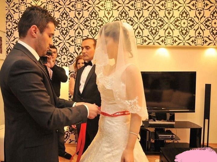 Через несколько дней наступает долгожданный день свадьбы. Во второй половине дня к дому невесты подъезжают свадебный кортеж, а также музыканты. Гости начинают танцевать под звуки живой музыки. Через некоторое время жених поднимается к невесте. И тут начинают проводиться интересные свадебные обряды. Родственник со стороны жениха, чаще всего это мужчина почтенного возраста, завязывает и развязывает красную ленту на талии невесты три раза, а на третий – закрепляет ее окончательно. Обряд опоясывания невесты – символ вечной привязанности к надежному мужу, который является поддержкой и опорой для жены и для семьи.