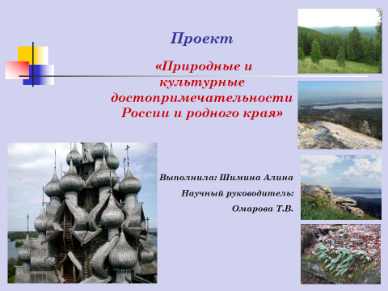 Создать наглядно-информационную папку (справочник) с материалами о природных и культурных достопримечательностях России и родного края, на основе которого можно увидеть всё разнообразие и неповторимость природы и культуры России. |
