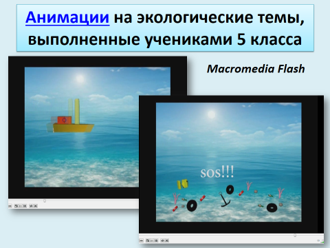 Когда дети выполняют проекты, они должны чётко понимать, что обязательно должен быть конечный продукт. Пусть в виде рисунка, плаката, презентации, изготовленного буклета, какой-либо акции, и однажды учащиеся предложили придумывать и делать анимации на экологические темы, а потом показывать их маленьким детям. Их можно делать в программе Macromedia Flash. Конечно же, представление объектов и процессов не традиционным текстовым описанием, а с помощью анимации, видео, графики, звука, намного интереснее воспринимается.