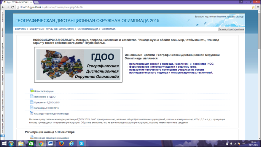 Тема олимпиады «Новосибирская область. История, природа, население и хозяйство». Выбор темы объясняется необходимостью изучения природы нашей области, понимания причин разнообразия народов, живущих в пределах области, осмысления истории и особенностей развития хозяйства области в разные исторические эпохи. Неслучайно эпиграфом к олимпиаде стали слова Пауло Коэльо "Иногда нужно обойти весь мир, чтобы понять, что клад зарыт у твоего собственного дома". В сети Интернет авторский дистанционный курс «Географическая дистанционная окружная олимпиада» доступен по адресу: http://cloud10.gym10nsk.ru/distance/course/view.php?id=26.