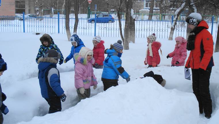 Я использую зимние условия для упражнений детей в следующих движениях: ходьба по следам, ходьба, высоко поднимая колени, приставным шагом вправо и влево, восхождение на горку и спуск с неё, ходьба змейкой между сугробами, вокруг сугроба.
