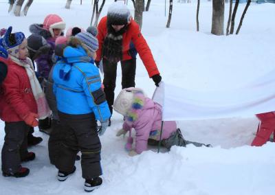 Подлезание под арку в снежном тоннеле, прыжки вокруг сугроба, через ледяную дорожку.