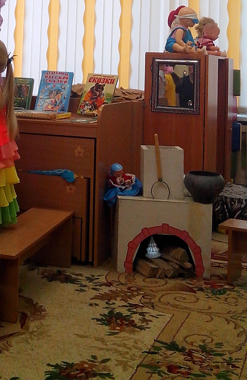Пособия: видео иллюстрации к русским народным сказкам, потешкам, считалки; макет русской печки, предметы русского быта, интерактивная доска, экран, проектор или телевизор с картой памяти, костюм бабушки Василисы или кукла на руку, интерьер группы оформляется в виде деревенской избы.