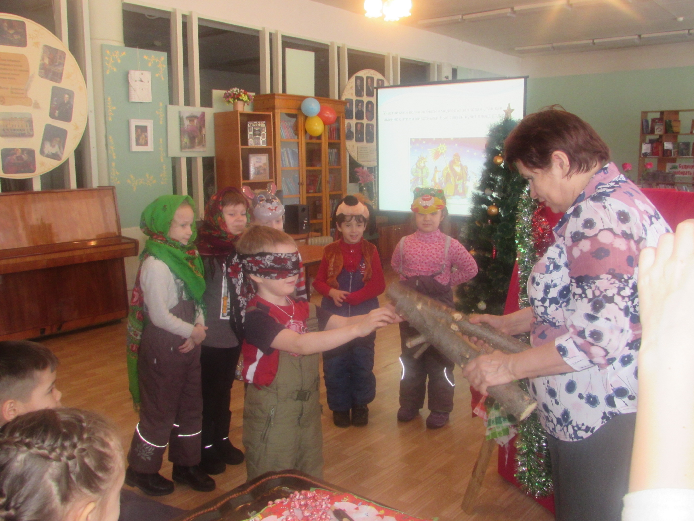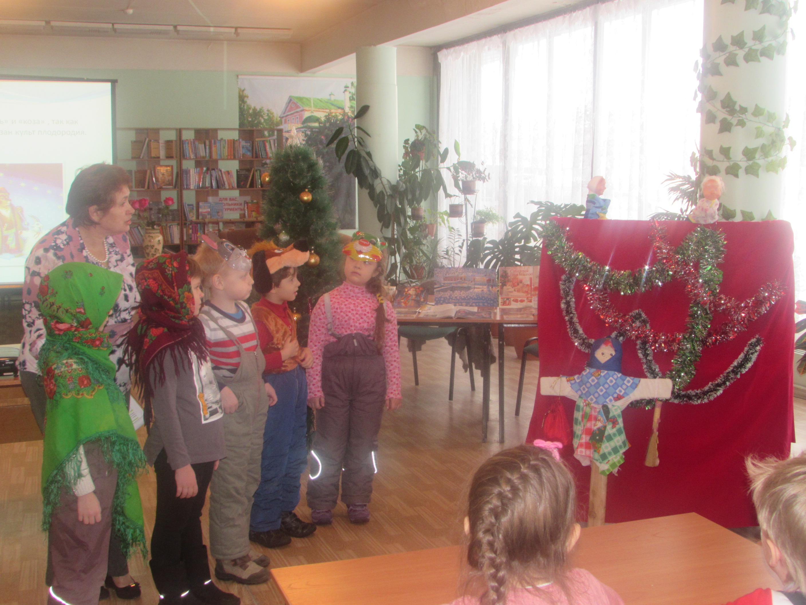 Чтобы получить от праздников радость и пользу, надо понимать их смысл, поэтому нам предложили не только познакомиться с обычаями и традициями, но и поучаствовать в обрядах. Ребятам были предложены костюмы для ряжения: платки, маски, костюмы. Дети с удовольствием окунулись в атмосферу новогоднего празднества. Затем сотрудники библиотеки разыграли рождественский мини-спектакль «Святочные колядки» с участием наших детей, которые пели рождественские колядки. Далее ребятам предложили поучаствовать в обряде колядования.