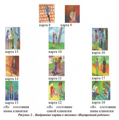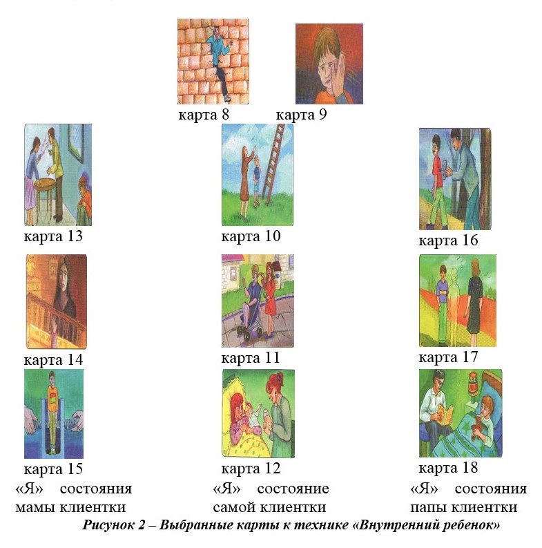 Мы предположили, что причины проблемы связаны с детской травмой и с негативными родительскими предписаниями и установками, полученными в детстве. Поэтому для дальнейшей работы выбрана техника «Жизненный сценарий» и набор карт «Внутренний ребенок».