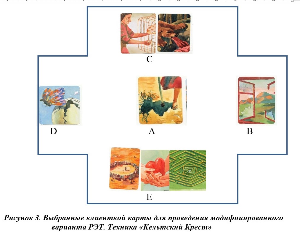 Для закрепления эффекта терапии мы использовали дополнительный модифицированный вариант РЭТ в формате техники «Кельтский Крест». (рисунок 3). Карты раскладываются на заранее заготовленный шаблон, представленный на рисунке 3.