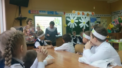 А группа учёных сложила и склеила из слов ромашку пожеланий, которую прикрепили на доску.