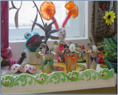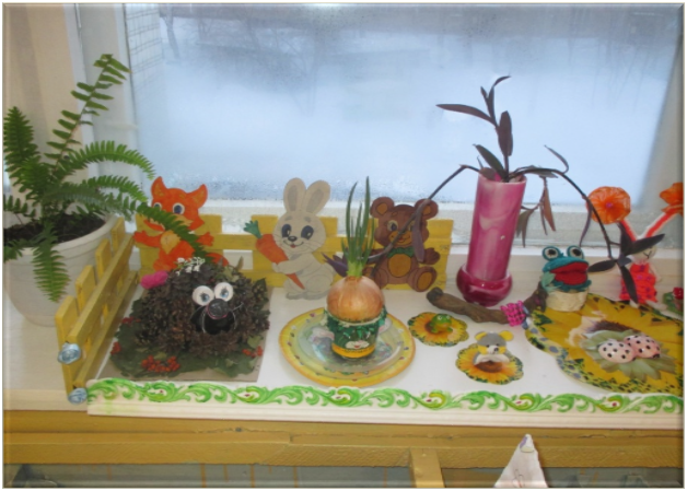 Ни с чем несравнимая роль в развитии у детей эстетических чувств принадлежит природе. Как известно, эстетическое восприятие природы, чувство красоты не является врожденным, его надо постоянно развивать, и чем раньше, тем результативнее. Я убеждена в необходимости окружить ребенка красотой, чтобы он проникся мыслью – важно не только сохранять красоту, но и творить ее. На подоконнике своей группы мы с ребятами начали «творить» «Огородную сказку». Старательно подбирали и эстетически украшали одноразовые стаканчики, коробки из-под сока. Веселые мордашки появились и на яичной скорлупе, и на стаканчиках из-под «Растишек». В «Огородной сказке» имеется и творчески оформленный (по инициативе детей) дневник наблюдения.