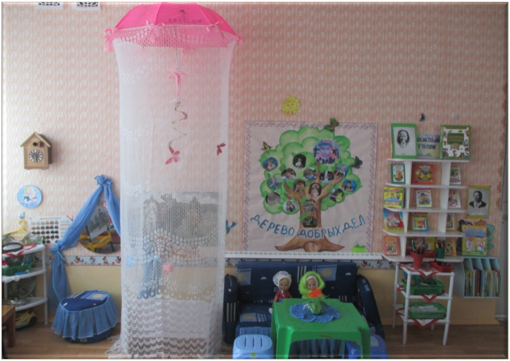 Систематические выставки, периодическая смена материала, композиций на «полочке красоты» способствует тому, что дети стали самостоятельно замечать появление новых предметов, картин, детских книг. Созерцая, любуясь и получая новые знания – у детей развиваются эстетические чувства. Посидишь, подумаешь под таким розовым зонтиком, полюбуешься предметами искусства и захочется сделать много добрых дел, чтоб сохранить эту красоту и приумножить. Так и «выросло» у нас в группе «Дерево добрых дел». На дереве, вокруг фотографий детей, периодически появляются зеленые листочки – это добрые дела, которые совершают ребята. Теперь «Дерево добрых дел» – украшение нашей группы.