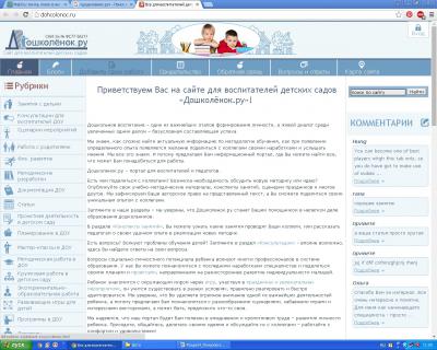 Изучим содержание сайта «Дошколёнок.ру». С точки зрения дизайна, привлекательности для пользователей, данный сайт очень лаконичный, не яркий. Но это не мешает посетителю получать предлагаемую информацию. На данном сайте педагогам дошкольного образования предлагается информация различного характера: это сценарии, методические разработки, развивающие игры для детей разных групп пребывания в дошкольном учреждении, документация, необходимая при работе в ДОУ, статьи педагогов, делящихся опытом работы и своим профессиональным мастерством. Также сайт может быть полезен родителям. К сожалению, навигация по сайту требует коррекции для повышения уровня комфортности пользователей.