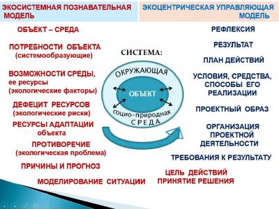 Экосистемная познавательная модель выступает основой для формирования экоцентрической управляющей модели, которая обобщает принципы экологически ориентированных действий (поведения, деятельности) в рамках экологических, нравственных, правовых императивов (запретов, ограничений) на основе ценностей устойчивого развития. Экоцентрическая управляющая модель – модель экологически ориентированной социальной деятельности в повседневной практике; это способ эколого-ориентированной предметно-преобразующей деятельности (экологический проект) [2,5]. Она направлена на решение учебных задач по формированию основ такой деятельности: