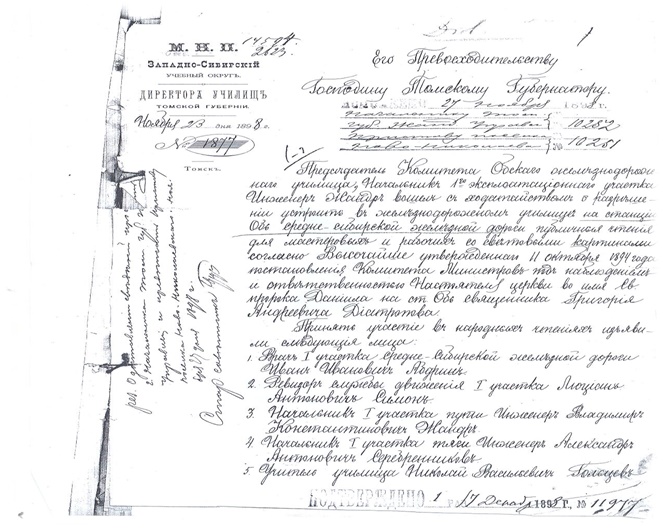 Интерес к личности врача И.И. Абдрина зародился у нас во время изучения делопроизводственных исторических источников, касающихся одного из основателей Новосибирска – инженера-путейца В. К. Жандра [16]. В ходатайстве «О проведении народных чтений для мастеровых и рабочих в железнодорожном училище на ст. Обь», отправленном на имя генерал-губернатора Томской губернии, среди прочих подписался и врач I участка Средне-Сибирской железной дороги И. И. Абдрин [8, л. 1] (приложение 1).