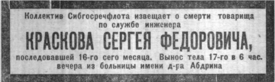 Уже упомянутая статья о враче в ССЭ, напечатанная в 1929 г., также свидетельствует о вкладе И. И. Абдрина в развитие новосибирской медицины. В некрологе одного из выпусков «Советской Сибири» нами найдено упоминание больницы имени доктора Абдрина: «Коллектив Сибгосречфлота извещает о смерти товарища по службе, инженера Краскова Сергея Федоровича, последовавшей 16-го сего месяца. Вынос тела 17-го в 6 часов вечера из больницы имени д-ра Абдрина» [15, с. 5] (приложение 5). Судя по отсутствию информации об этой больнице в справочной литературе, скорее всего, это название было неофициальным.