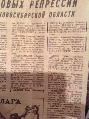 - Списки жертв массовых репрессии в Новосибирской области // Ведомости Новосибирского областного Совета депутатов. 1990. 24–30 августа.