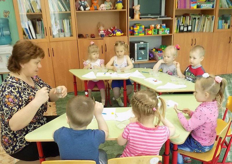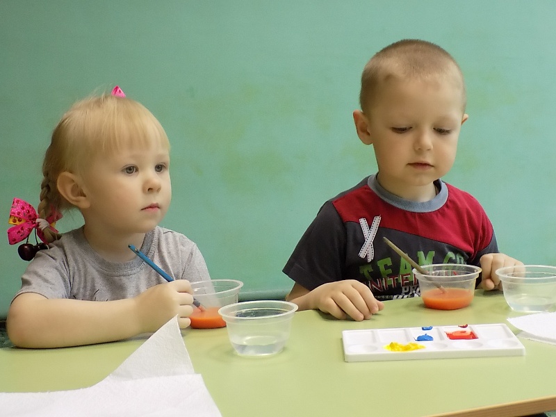Детям очень нравится играть с водой. Во время игры дети с завороженными лицами наблюдают за изменением цвета воды. Для проведения игры «Цветная вода» я использую две емкости с водой, кисть и краски. Прошу детей рассмотреть, какого цвета вода (прозрачная). После этого предлагаю им самим закрасить воду одним из понравившихся цветов краски. Конечно же, вода изменит свой цвет, и будет такого цвета, какой цвет краски выбрал ребенок. Когда у них все получается, лица светятся от увиденного.