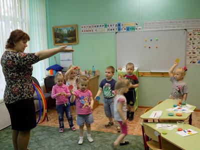 Площадь учебного кабинета позволяет включать в учебное занятие подвижные игры, которые укрепляют физическое здоровье детей, развивают умения выполнять движение по сигналу, бегать по разным направлениям и наперегонки, прыгать, скакать. Также они влияют на развитие мышления, смекалки, сноровки, ловкости, морально волевых качеств. Детям очень нравится игра «Кот и мыши». Дети — «мыши» сидят в норках (на стульях вдоль стены). В одном из углов площадки сидит «кошка» — педагог. «Кошка» засыпает, и «мыши» разбегаются по залу. «Кошка» просыпается, мяукает, начинает ловить «мышей», которые бегут в норки и занимают свои места. Когда все «мыши» вернутся в норки, «кошка» еще раз проходит по залу, затем возвращается на свое место и засыпает. Считалочкой выбирается водящий ребенок и игра продолжается.