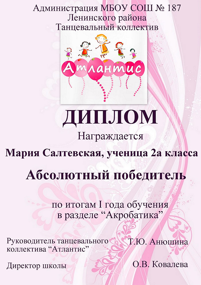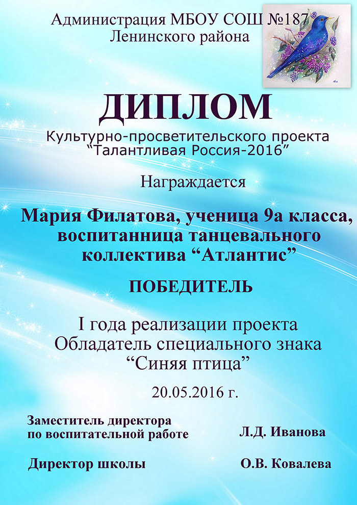 Актерское мастерство, сценическую культуру, хореографическое исполнение воспитанники «Атлантиса» продемонстрировали на традиционном итоговом празднике танца. Было представлено 13 хореографических постановок, новые сценические костюмы. Зрительскую симпатию завоевали танцы «Дисней» и «Русская плясовая» в исполнении младшей и старшей группы. Названы имена отличившихся детей в танцевальном исполнении: Алена Миляева, Дарья Борисова и София Ицкова. Обладателями специального знака «Синяя птица» – талисмана проекта «Талантливая Россия» стали Виктория Горбачева и Мария Филатова. Почетный гость праздника депутат Городского совета депутатов Николай Андреевич Тямин вручил именные стипендии пятиклассницам Дане Пильщиковой и Ксении Баздыревой, которые были признаны самыми талантливыми школьниками на параллели 5-ых классов. Одиннадцать родителей воспитанников коллектива были отмечены благодарственными письмами депутата и администрации образовательного учреждения за достойное воспитание детей и создание условий личностного развития.