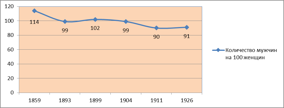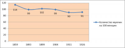 Рис. 3. Изменение половой структуры населения (количества мужчин на 100 женщин) в д. Толмачёвой