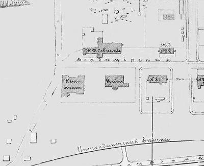 А здание первой школы нынешнего Железнодорожного района и сейчас неприметно стоит на углу улицы Владимировской и Владимировского спуска. За эти годы здание несколько раз перестраивалось. Под нужды переселенческого пункта и др. организаций.