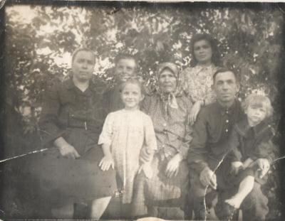 О семье и быте. Я родилась в 1950 году в семье, состоящей из семи человек. На фотографии (рис. 1) справа налево: я (на коленях у отца), Маша (самая старшая сестра), бабушка Фёкла, сестра Надя, брат Толик и мама. Отец после войны трудился на продовольственной базе грузчиком, мама работала по хозяйству дома. Семья была очень дружной. Папа был очень добр характером, несмотря на то, что прошёл войну. А мама была строгой. Вероятно это у неё от военных лет, когда она держала на себе дом, детей и какую-никакую скотину.