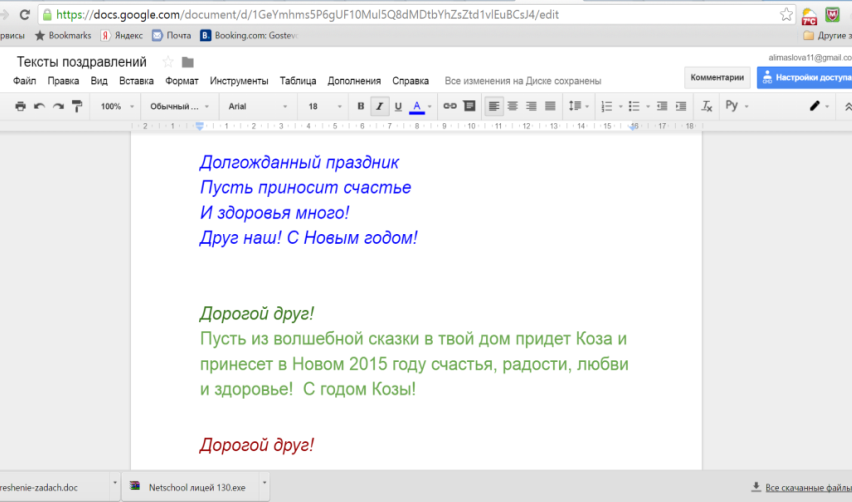 Для совместной работы необходимо было создать страницу на Google-диске, организовать совместный доступ для всех, у кого есть ссылка и отправить ссылку в сообщении для учащихся через локальную почту лицея ИС NetSchool.