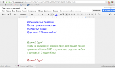 Проект «Новый год с доставкой на дом». Цель – оказание благотворительной помощи детям-инвалидам, не выходящим из дома. Проект действует в классе на протяжении четырех лет. Ребята в течение декабря 2014 года сшили своими руками игрушки, подготовили и подписали открытки, принесли конфеты и сформировали 30 подарков. Общий Google-документ был использован для создания копилки выкроек игрушек, текстов поздравлений.
